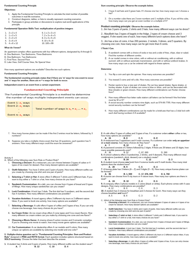 2. Outfit Selection: You have 3 shirts and 2 pairs of pants. How many different outfits can 7. A license plate has 3 letters (A – Z) and 3 digits (0 – 9). How many unique license plates can