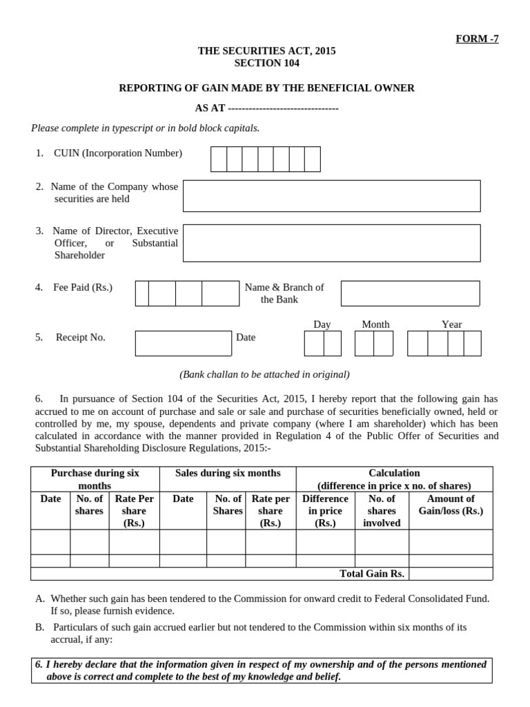 6. In pursuance of Section 104 of the Securities Act, 2015, I hereby report that the following gain has