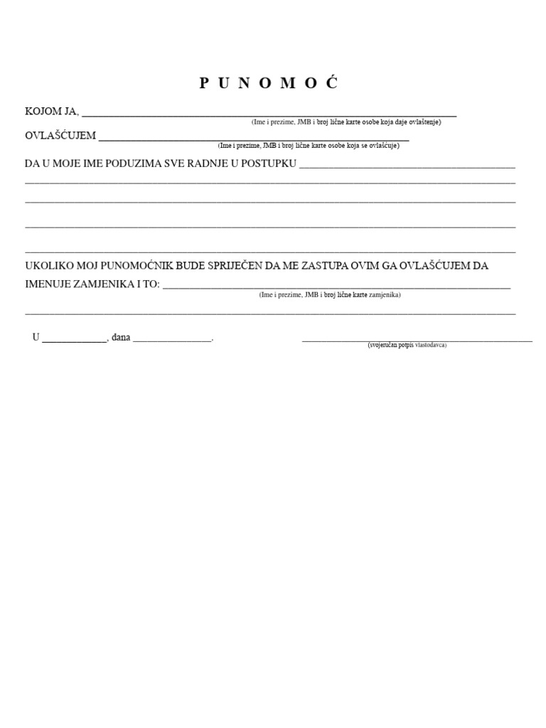 UKOLIKO MOJ PUNOMOĆNIK BUDE SPRIJEČEN DA ME ZASTUPA OVIM GA OVLAŠĆUJEM DA