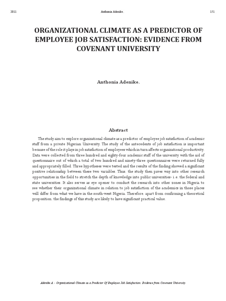 ORGANIZATIONAL CLIMATE AS A PREDICTOR OF EMPLOYEE JOB SATISFACTION: EVIDENCE FROM COVENANT UNIVERSITY