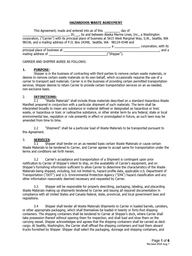___________________________, 20___, by and between Alaska Marine Lines, Inc., a Washington