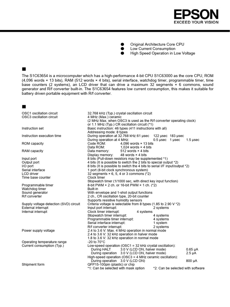 generator and R/f converter built-in. The S1C63654 features low current consumption, this makes it suitable for