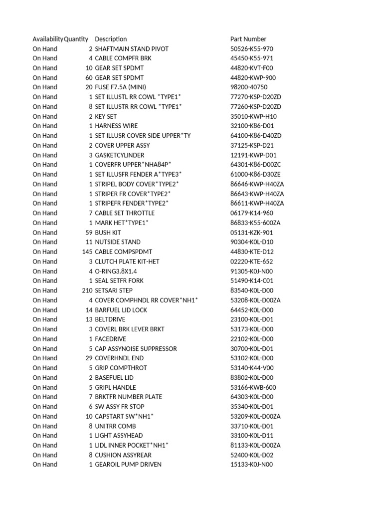 AvailabilityQuantity Descriptio Part Number Inventory Location Unit Price
