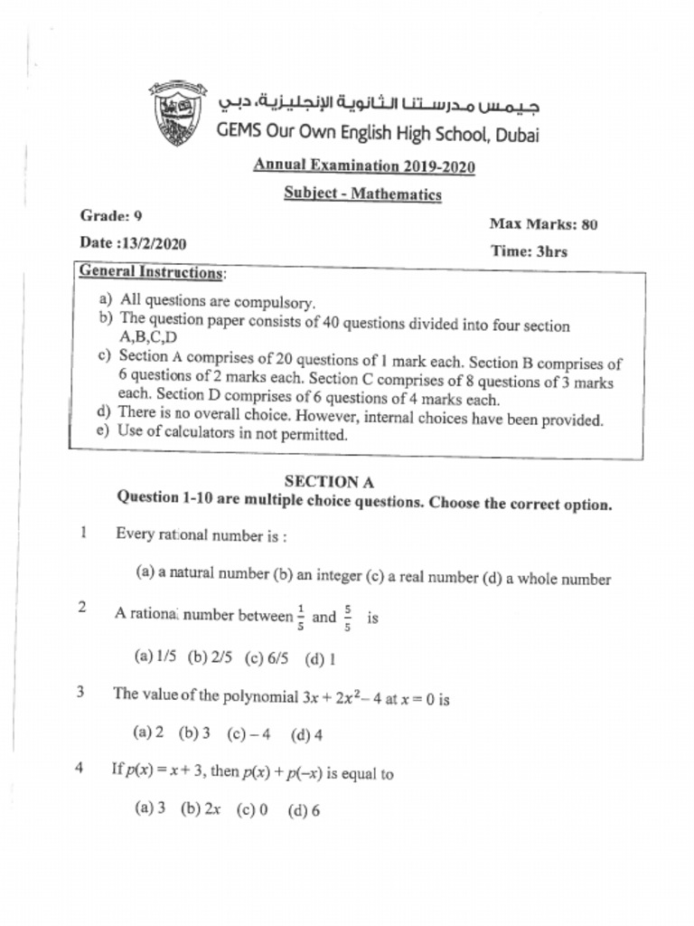 Grade: 9 Max Marks: 80