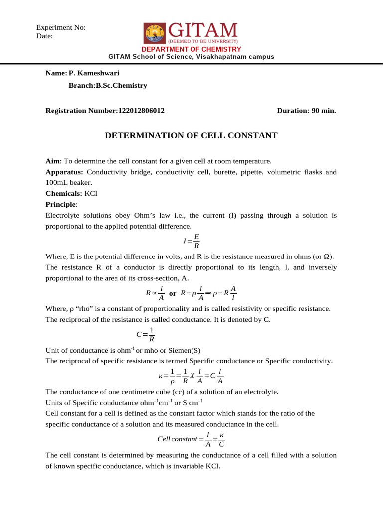 Aim: To determine the cell constant for a given cell at room temperature.