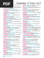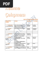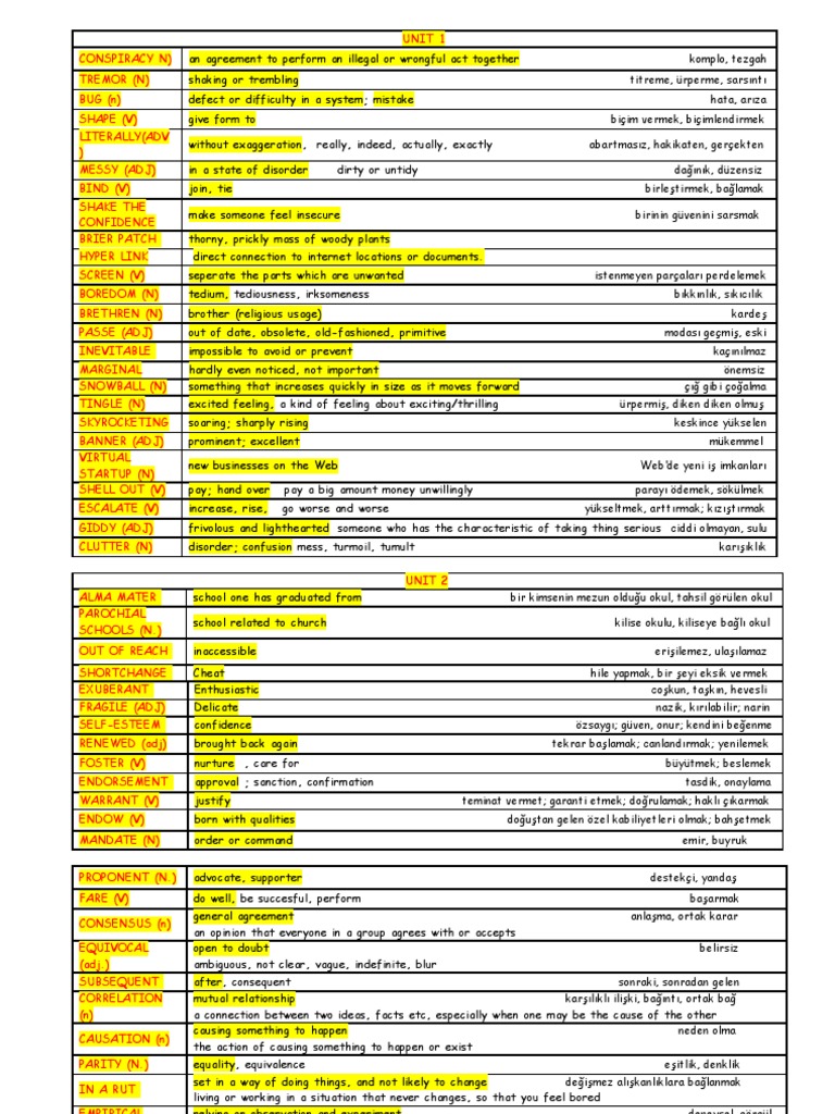 people who do a little of everything her ey hakknda az bilgisi olan kii s.o who can do many different types of work, but who often is not very skilled at any of them people with no moral principles. alak, adi, hain kimse a bad or dishonest man, especially someone who cheats or deceives other people Discredited kirletmek, lekelemek, deerini drmek to spoil or reduce the value of something that was perfect; go bad, decoy situation with both favorable and unfavorable choices UNIT 6 - READING combining sentezle birletirmek, oluturmak to make something by combining different things or substances model; example rnek; numune a model or example that shows how something works or is produced Cause of great suffering ceza ektirme, iddetli ac ektirme something that causes a lot of harm or suffering UNIT 6- READING stagnation; motionlessness hareketsizlik, durgunluk a state or period in which there is no change or development educational emphasis on trade or industry meslekiyetilik outstanding; easily noticed gze arpan, dikkati eken possibly false; questionable pheli, zan altnda bulunan someone who is thought to be guilty of a crime inflexible; hardened sertlemi, ta haline gelmi to become hard, or make something hard, by adding lime . leaning to one side bir tarafa meyilli, orantsz having one side that is lower or heavier than the other based dayanma, dayandrma the part of a sentence that makes a statement about the subject, such as 'swim' in 'Fish swim' and 'is an artist' in 'She is an artist' accumulated and not processed beklemekte olan yaplmas gerekli iler a large amount of work that you need to complete, especially work that should already have been completed depleted; completely without use tkenmi, batm completely lacking a particular good quality fall behind gerilemek, geri kalmak to move or develop more slowly than others are exposed to continuous severe criticism iddetli eletiriye maruz kalmak, sra daya yemek to be criticized or attacked by a lot of people move forward slowly yava yava sokulmak, yan yan ve yava srmek to move gradually with several small movements, or to make something do this demand loudly and continually haykrmak, yaygara koparmak getting along; doing stesinden gelmek, baarmak to be successful, unsuccessful etc become more instant uzaklamak, geri ekilmek; sznden dnmek if something you can see or hear recedes, it gets further and further away until it disappears move quickly and suddenly aniden ve hzlca hareket eden to take someone or something quickly away from a place UNIT 7 ikilem, kmaz