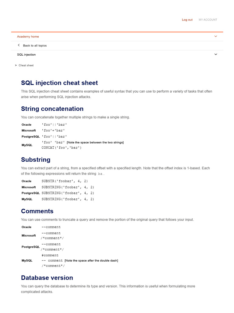 This SQL injection cheat sheet contains examples of useful syntax that you can use to perform a variety of tasks that often