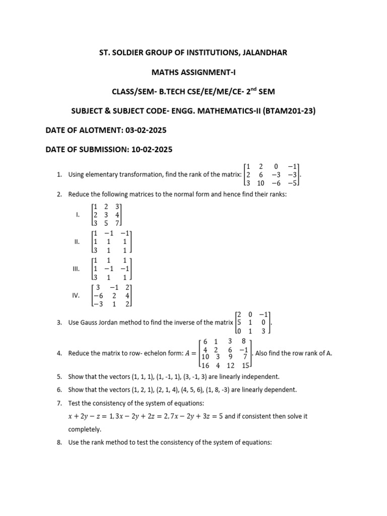 1. Using elementary transformation, find the rank of the matrix: [2 6 −3 −3].