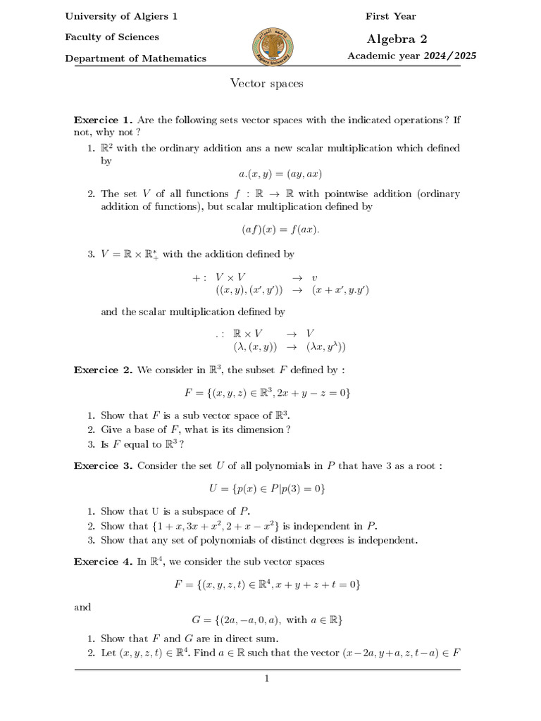 Exercice 1. Are the following sets vector spaces with the indicated operations ? If