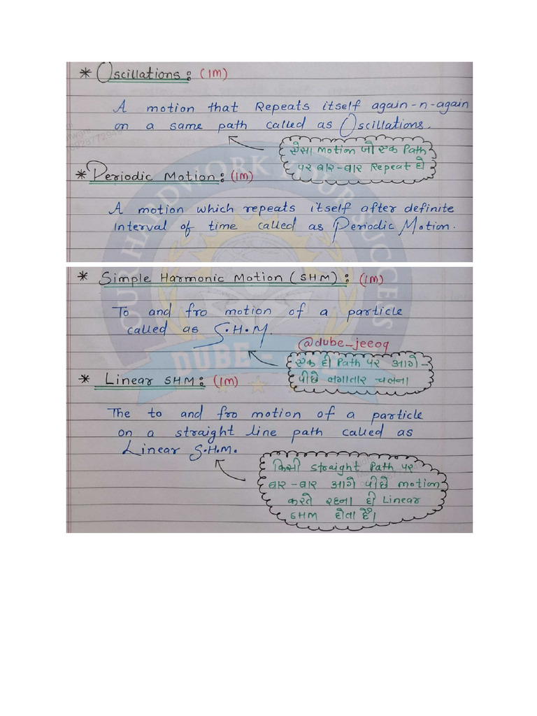 The document discusses the equations and principles related to simple harmonic motion (SHM), including displacement, velocity, and acceleration of a particle. It also explains the concept of phase in SHM and provides mathematical expressions for energy at mean and extreme positions. Additionally, it briefly describes the behavior of a simple pendulum under gravitational influence.