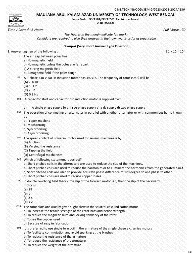 Paper Code : PC-EE501/PC-EEE501 Electric machine-II