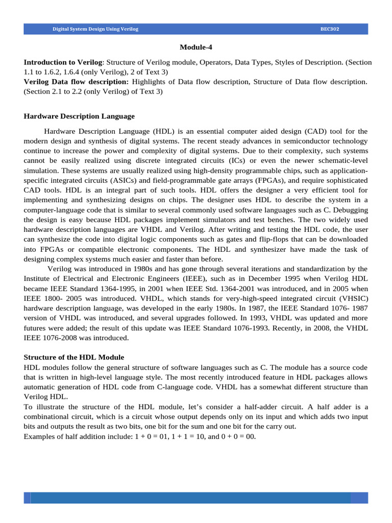 Introduction to Verilog: Structure of Verilog module, Operators, Data Types, Styles of Description. (Section