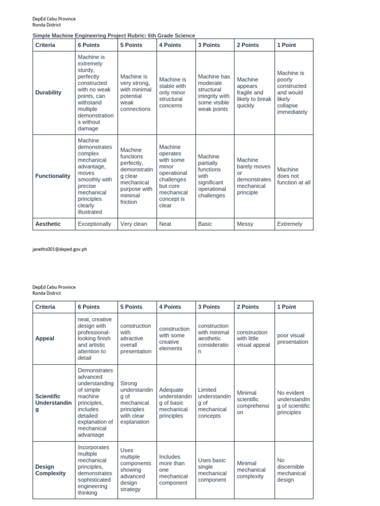 Simple Machine Engineering Project Rubric: 6th Grade Science