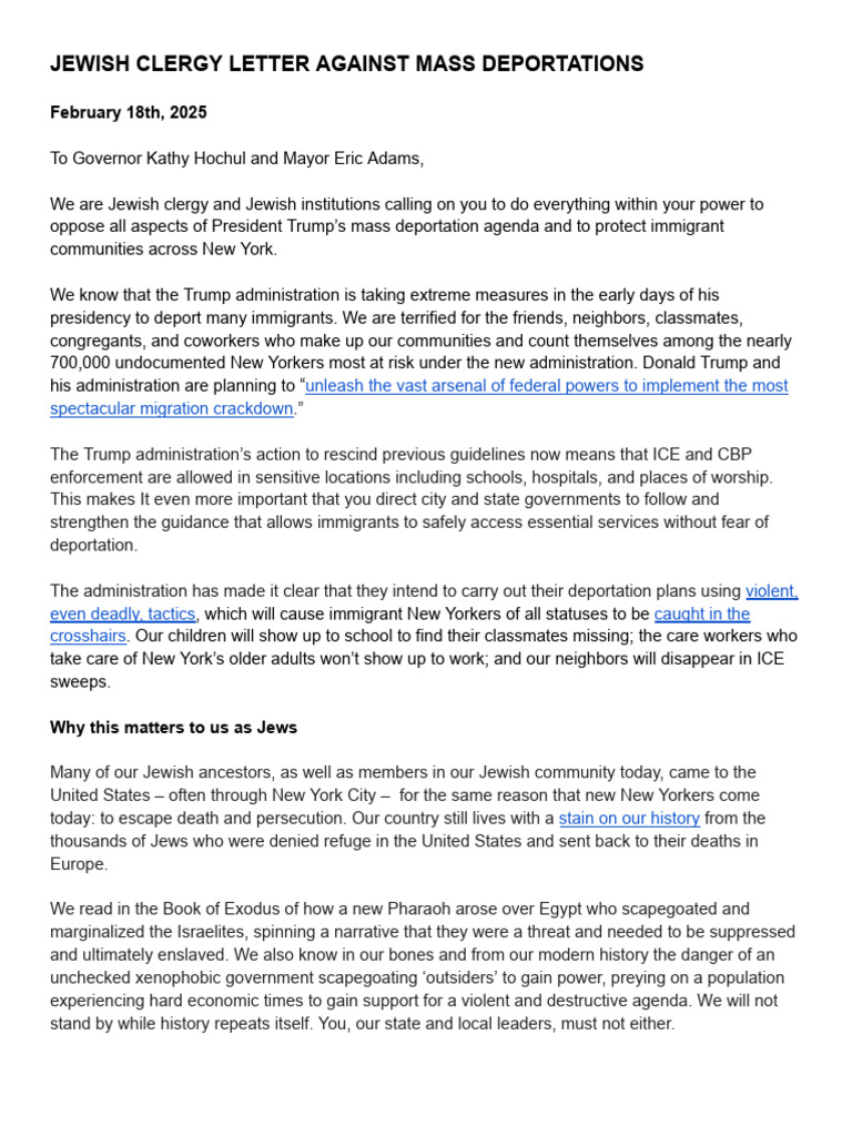 JEWISH CLERGY LETTER AGAINST MASS DEPORTATIONS