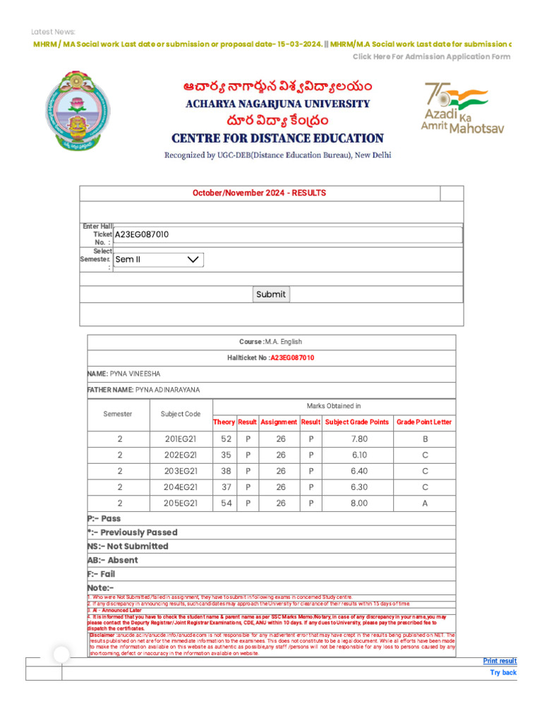 please contact the Depurty Registrar/Joint Registrar Examinations, CDE, ANU within 10 days. If any dues to University, please pay the prescribed fee to
