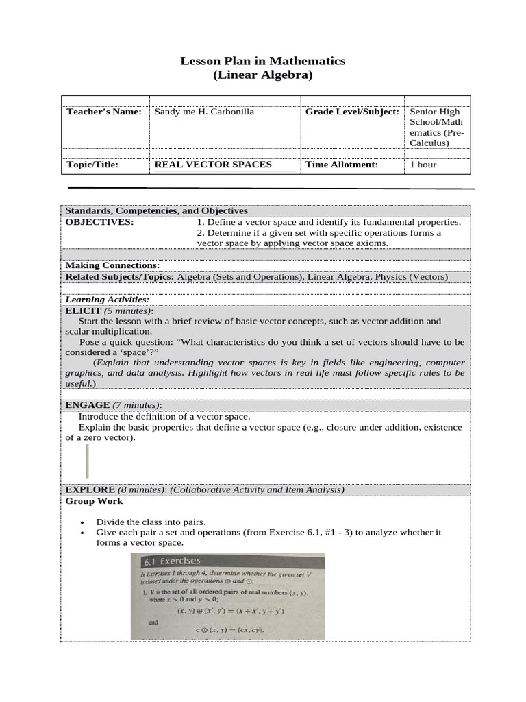 Topic/Title: REAL VECTOR SPACES Time Allotment: 1 hour
