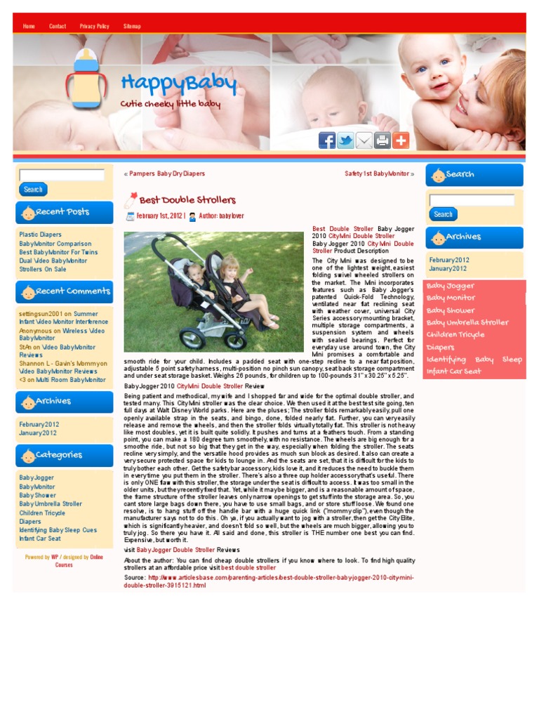 February 1st, 2012 | Author: babylover Best Double Stroller Baby Jogger 2010 City Mini Double Stroller Baby Jogger 2010 City Mini Double Stroller Product Description The City Mini was designed to be one of the lightest weight, easiest folding swivel wheeled strollers on the market. The Mini incorporates features such as Baby Jogger's patented Quick-Fold Technology, ventilated near flat reclining seat with weather cover, universal City Series accessory mounting bracket, multiple storage compartments, a suspension system and wheels with sealed bearings. Perfect for everyday use around town, the City Mini promises a comfortable and smooth ride for your child. Includes a padded seat with one-step recline to a near flat position, adjustable 5 point safety harness, multi-position no pinch sun canopy, seat back storage compartment and under seat storage basket. Weighs 26 pounds, for children up to 100-pounds 31" x 30.25" x 5.25". Baby Jogger 2010 City Mini Double Stroller Review Being patient and methodical, my wife and I shopped far and wide for the optimal double stroller, and tested many. This City Mini stroller was the clear choice. We then used it at the best test site going, ten full days at Walt Disney World parks. Here are the pluses; The stroller folds remarkably easily, pull one openly available strap in the seats, and bingo, done, folded nearly flat. Further, you can very easily release and remove the wheels, and then the stroller folds virtually totally flat. This stroller is not heavy like most doubles, yet it is built quite solidly. It pushes and turns at a feathers touch. From a standing point, you can make a 180 degree turn smoothely, with no resistance. The wheels are big enough for a smoothe ride, but not so big that they get in the way, especially when folding the stroller. The seats recline very simply, and the versatile hood provides as much sun block as desired. It also can create a very secure protected space for kids to lounge in. And the seats are set, that it is difficult for the kids to truly bother each other. Get the safety bar accessory, kids love it, and it reduces the need to buckle them in every time you put them in the stroller. There's also a three cup holder accessory that's useful. There is only ONE flaw with this stroller, the storage under the seat is difficult to access. It was too small in the older units, but they recently fixed that. Yet, while it may be bigger, and is a reasonable amount of space, the frame structure of the stroller leaves only narrow openings to get stuff into the storage area. So, you cant store large bags down there, you have to use small bags, and or store stuff loose. We found one resolve, is to hang stuff off the handle bar with a huge quick link ("mommy clip"), even though the manufacturer says not to do this. Oh ya, if you actually want to jog with a stroller, then get the City Elite, which is significantly heavier, and doesn't fold so well, but the wheels are much bigger, allowing you to truly jog. So there you have it. All said and done, this stroller is THE number one best you can find. Expensive, but worth it. visit Baby Jogger Double Stroller Reviews About the author: You can find cheap double strollers if you know where to look. To find high quality strollers at an affordable price visit best double stroller Source: [Link] Search