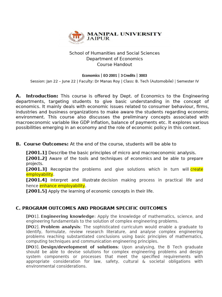 A. Introduction: This course is offered by Dept. of Economics to the Engineering