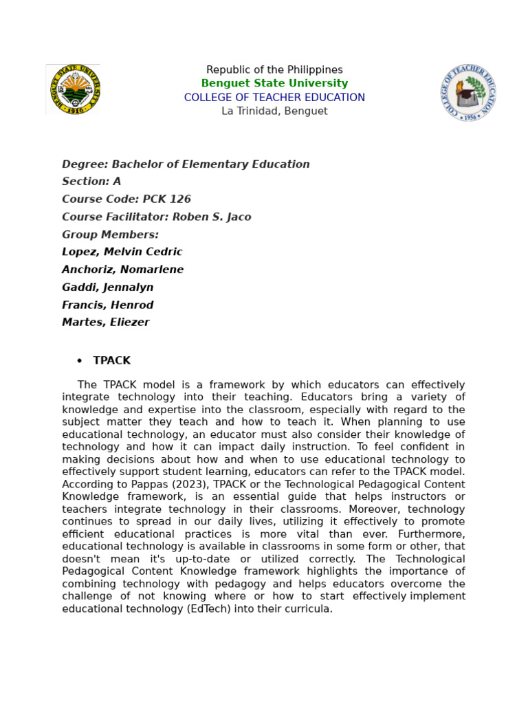 According to Pappas (2023), TPACK or the Technological Pedagogical Content