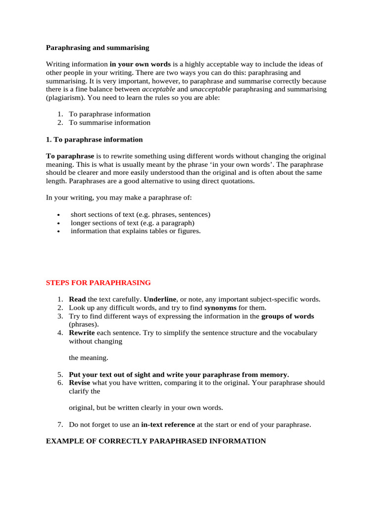 summarising. It is very important, however, to paraphrase and summarise correctly because