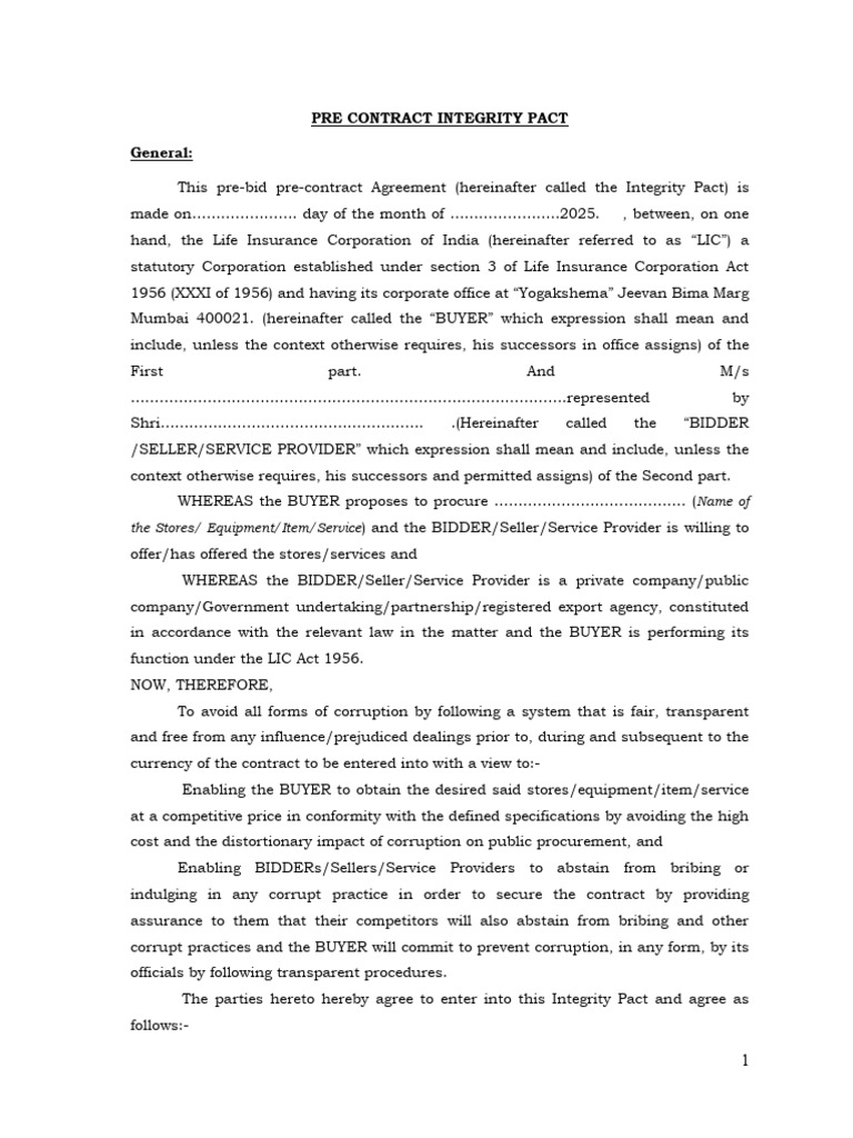 This pre-bid pre-contract Agreement (hereinafter called the Integrity Pact) is