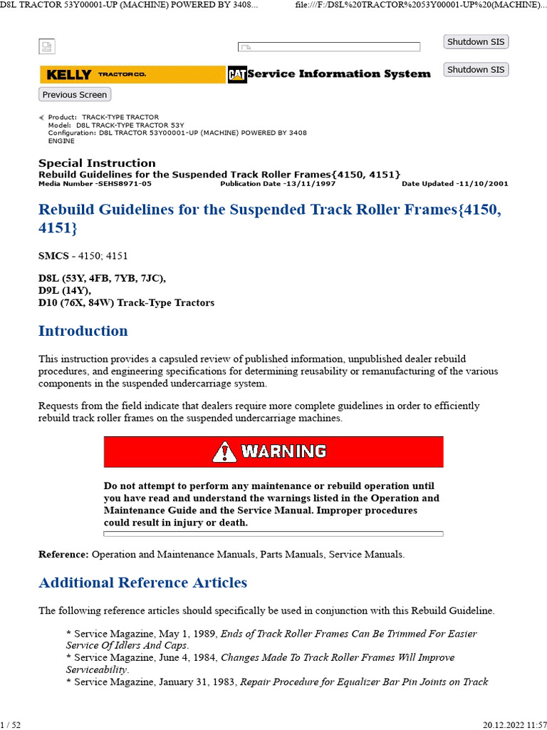 * Special Instruction, SEHS9102, entitled Repair of D8L and D9N Front Track Roller Frame.