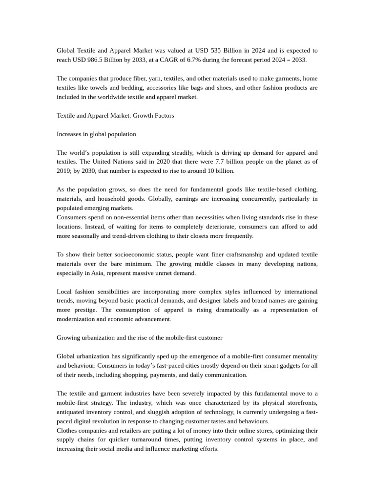 textile and apparel market. Innovations in textile manufacturing, such as sustainable production