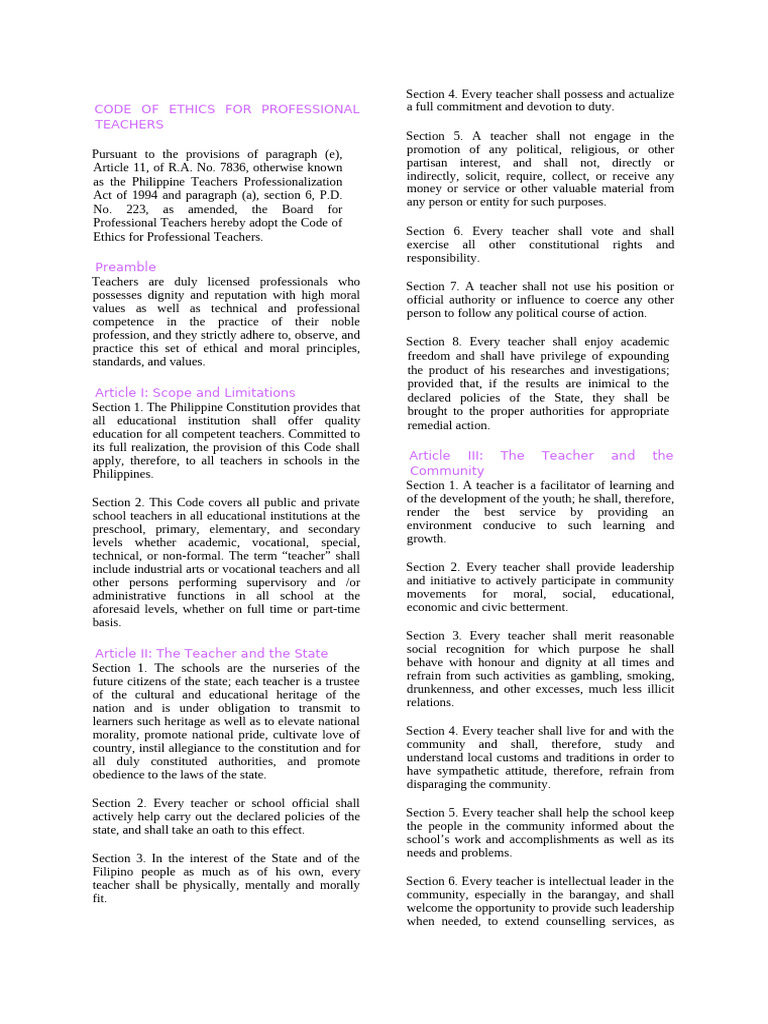 morality, promote national pride, cultivate love of Section 4. Every teacher shall live for and with the