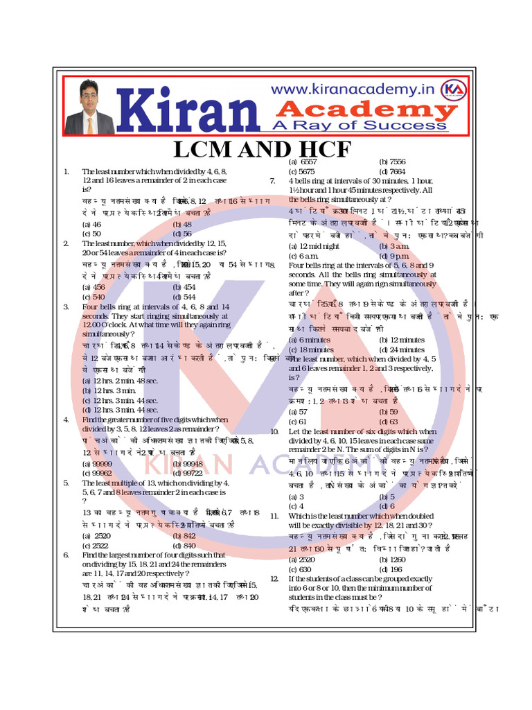 12 and 16 leaves a remainder of 2 in each case 7. 4 bells ring at intervals of 30 minutes, 1 hour,