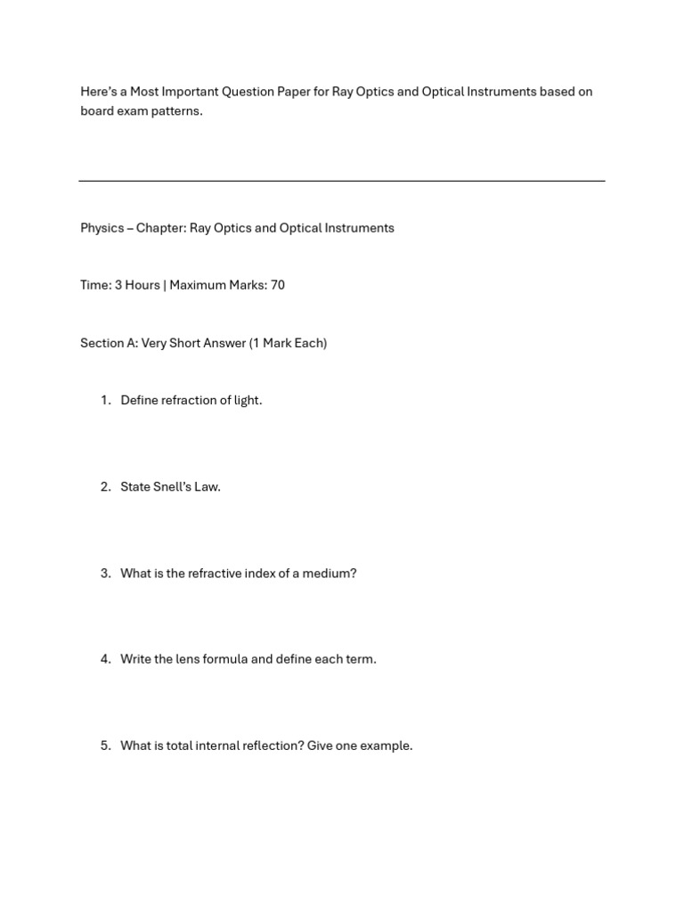 Here’s a Most Important Question Paper for Ray Optics and Optical Instruments based on