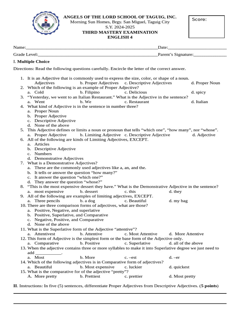 II. Instructions: In five (5) sentences, differentiate Proper Adjectives from Descriptive Adjectives. (5 points)