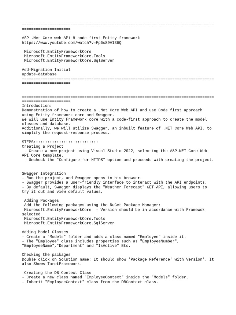 Demonstration of how to create a .Net Core Web API and use Code first approach