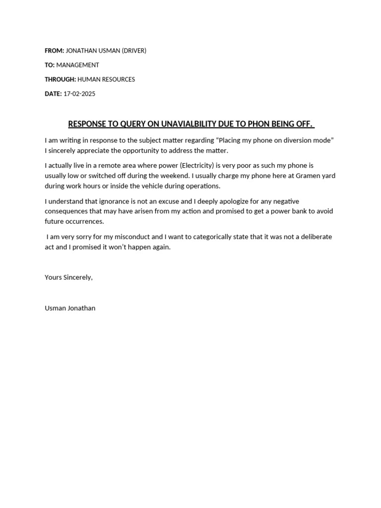 RESPONSE TO QUERY ON UNAVIALBILITY DUE TO PHON BEING OFF.
