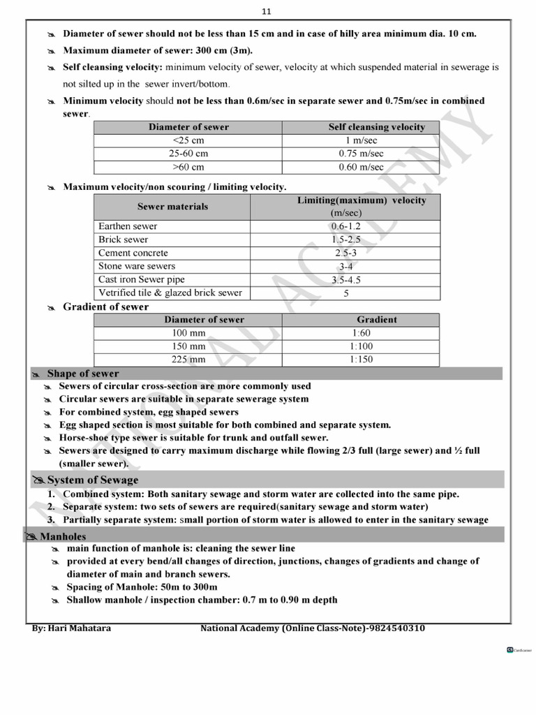 = Minimum velocity should not be less than 0.6m/sec in separate sewer and 0.75m/sec in combined