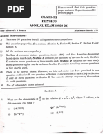 This document is an annual exam question paper for Class XI Physics for the academic year 2023-24, consisting of 33 questions across five sections. Each section has specific types of questions, including multiple-choice, assertion-reasoning, case studies, and long answer questions, with a total duration of 3 hours and a maximum score of 70 marks. General instructions include that all questions are compulsory, the use of calculators is not allowed, and internal choices are provided in certain questions.