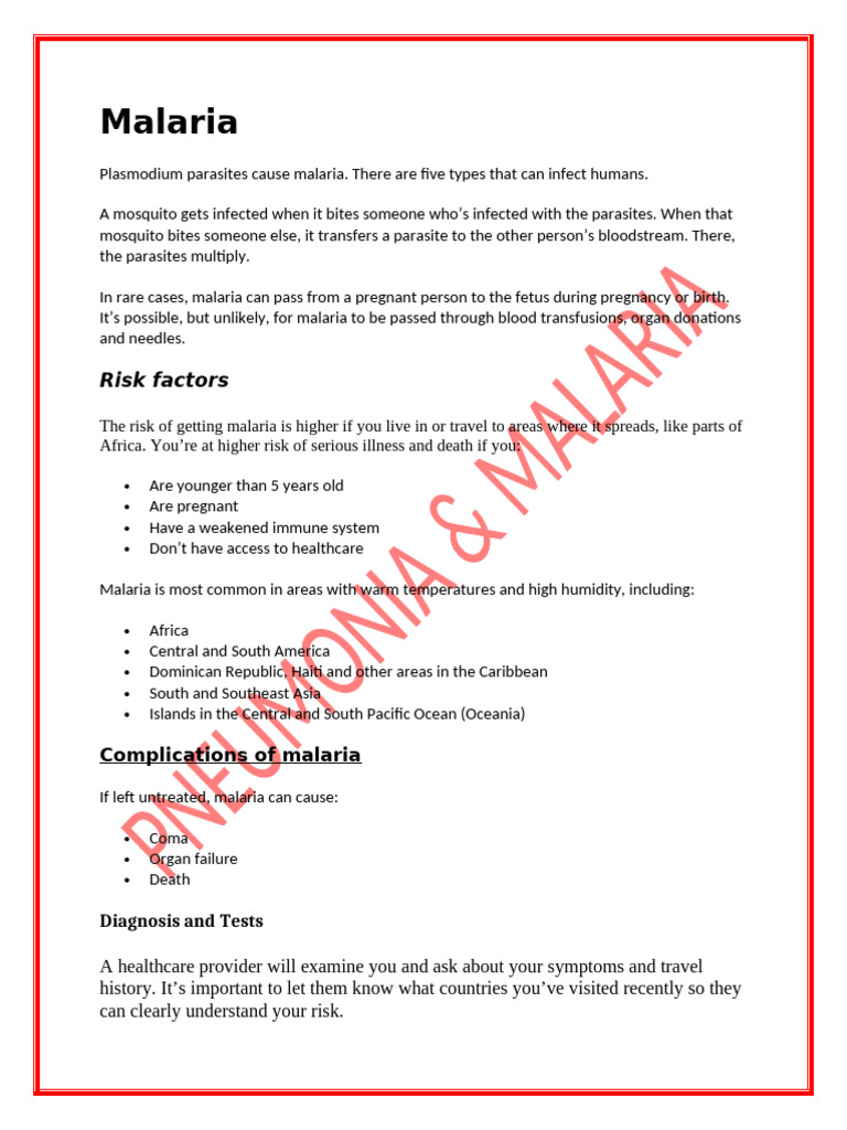 important to start treatment as soon as possible. If malaria isn’t treated properly, it can cause