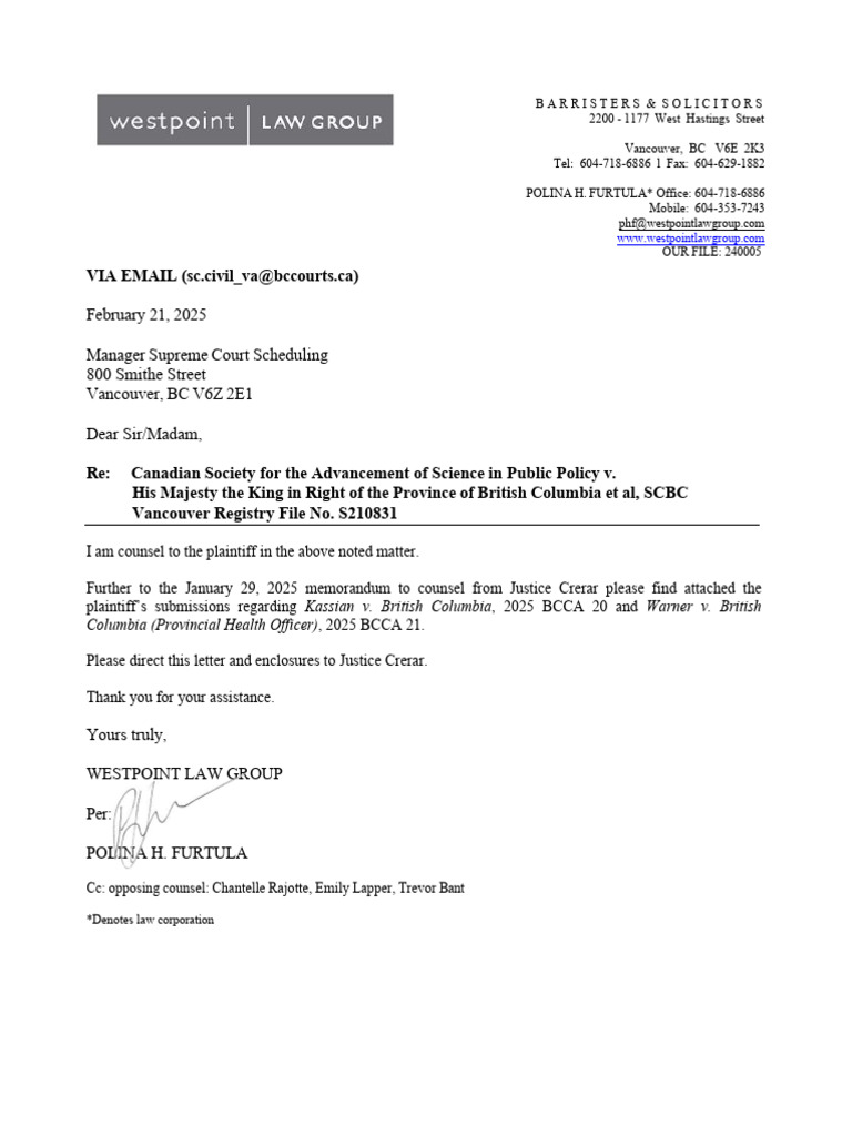 Columbia (Provincial Health Officer), 2025 BCCA 21 (“Warner”) and Kassian v. British