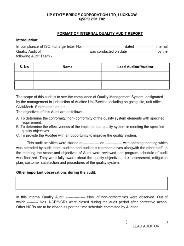 FORMAT OF INTERNAL QUALITY AUDIT REPORT