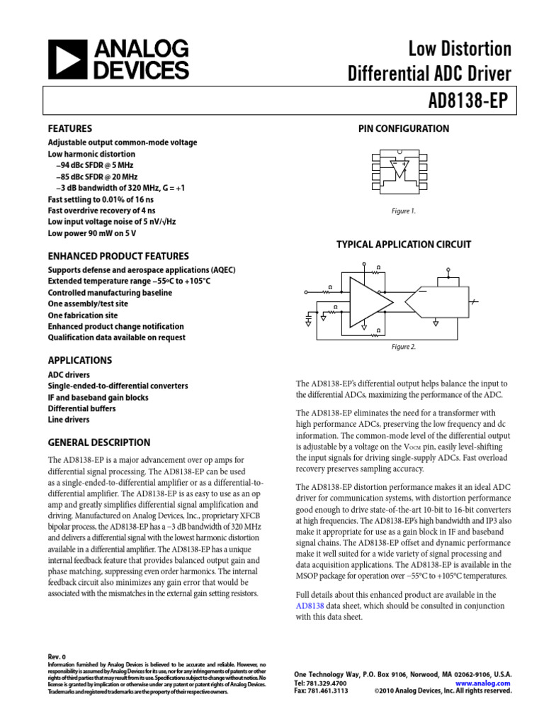 The AD8138-EP is a major advancement over op amps for the input signals for driving single-supply ADCs. Fast overload