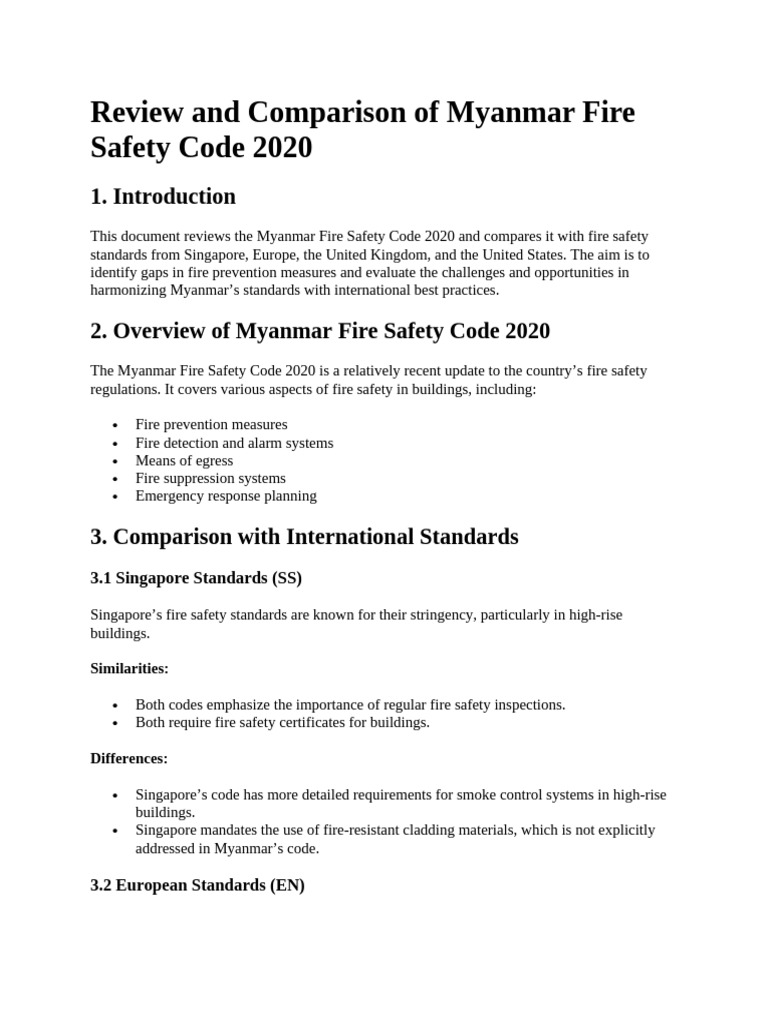 This document reviews the Myanmar Fire Safety Code 2020 and compares it with fire safety