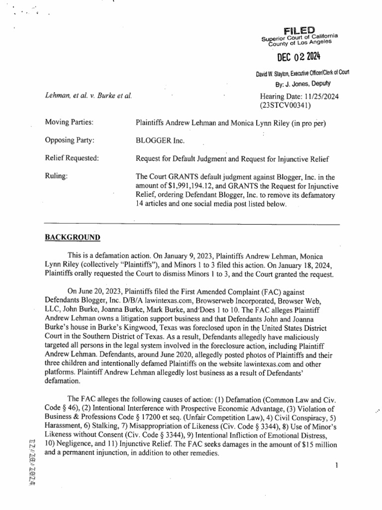 The Superior Court of California granted default judgment against Blogger, Inc. in a defamation case, awarding Plaintiffs Andrew Lehman and Monica Lynn Riley $1,991,194.12 and ordering the removal of 14 defamatory articles and one social media post. The court found sufficient evidence of defamation and irreparable harm to the Plaintiffs due to the false statements published by the Defendant. The case involved multiple causes of action, including defamation and intentional interference with economic advantage, stemming from defamatory content posted online by the Defendants.