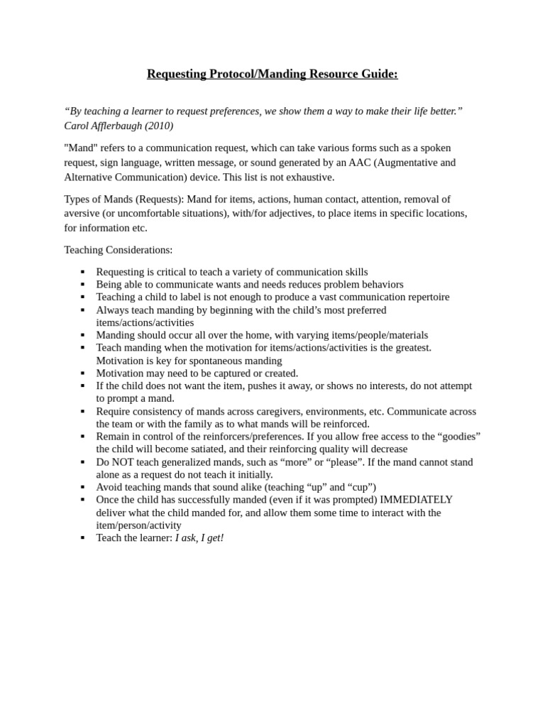 Types of Mands (Requests): Mand for items, actions, human contact, attention, removal of