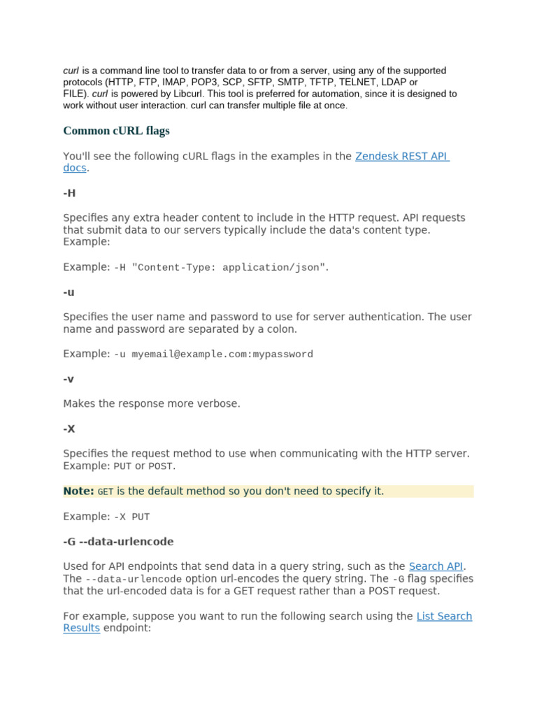 You'll see the following cURL flags in the examples in the Zendesk REST API