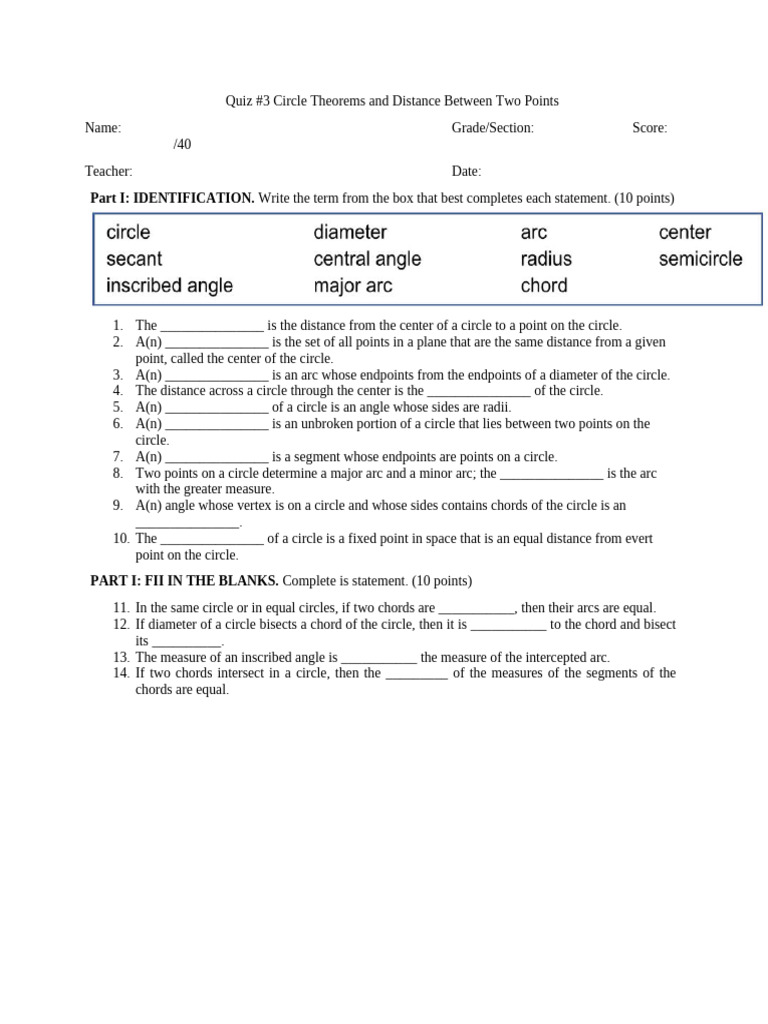 Quiz #3 Circle Theorems and Distance Between Two Points
