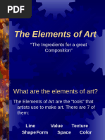 There are seven elements in art. They are color, form, line, shape, space, texture, and value.