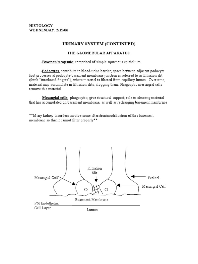 THE GLOMERULAR APPARATUS: -Bowmans capsule: comprised of simple squamous epithelium -Podocytes: contribute to blood-urine barrier; space between adjacent podocyte foot processes at podocyte-basement membrane junction is referred to as filtration slit (think interlaced fingers), where material is filtered from capillary lumen. Over time, material may accumulate in filtration slits, clogging them. Phagocytic mesangial cells remove this material. -Mesangial cells: phagocytic; give structural support; role in cleaning material that has accumulated on basement membrane, as well as recharging basement membrane **Many kidney disorders involve some alteration/modification of this basement membrane so that it cannot filter properly**