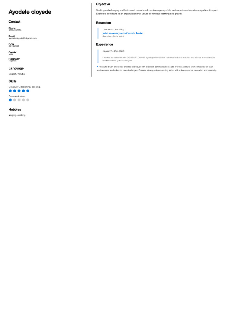 I worked as a cleaner with GQ BEAR LOUNGE agodi garden Ibadan, I also worked as a teacher, and also as a social media