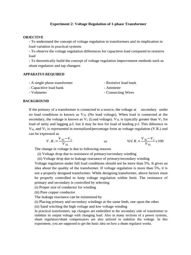 Experiment 2: Voltage Regulation of 1-phase Transformer