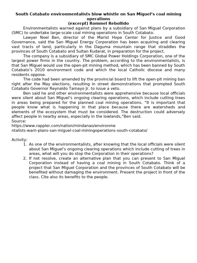 Corporation instead of having a coal mining in South Cotabato. Think of a