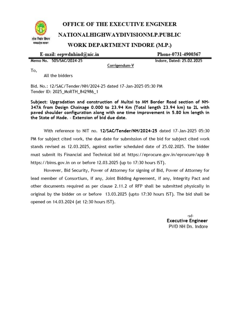 Subject: Upgradation and construction of Multai to MH Border Road section of NH-